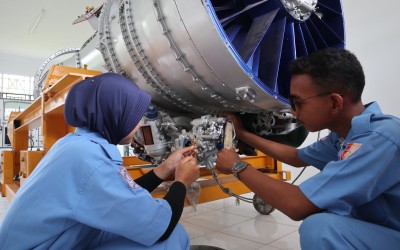 Siswa-siswi SMKN 2 Penerbangan saat merakit pesawat mini di ruang praktek.